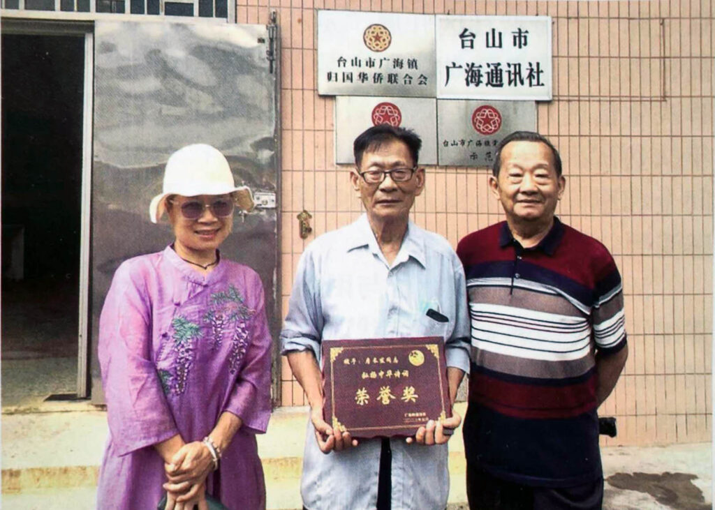 今年5月,广海通讯社社 长兼主编詹长发,获得了广东 省岭南诗社的“为弘扬中华诗 词作出突出贡献的表彰”,台山 市诗词学会会长梁伊焕、麦维 匡等领导一行三人,专程来到 广海侨联会、通讯社,将表彰 证书交给詹长发主编。并鼓励 他继续发挥余热。